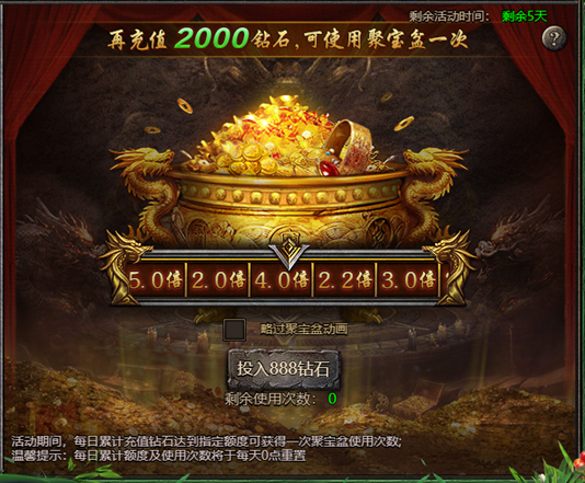 活动说明:活动期间玩家每日充值到达指定金额即可获得一次聚宝盆使用次数,消耗使用次数以及一定数量钻石将获得轮盘指向倍率*消耗钻石数量的绑定钻石返利。